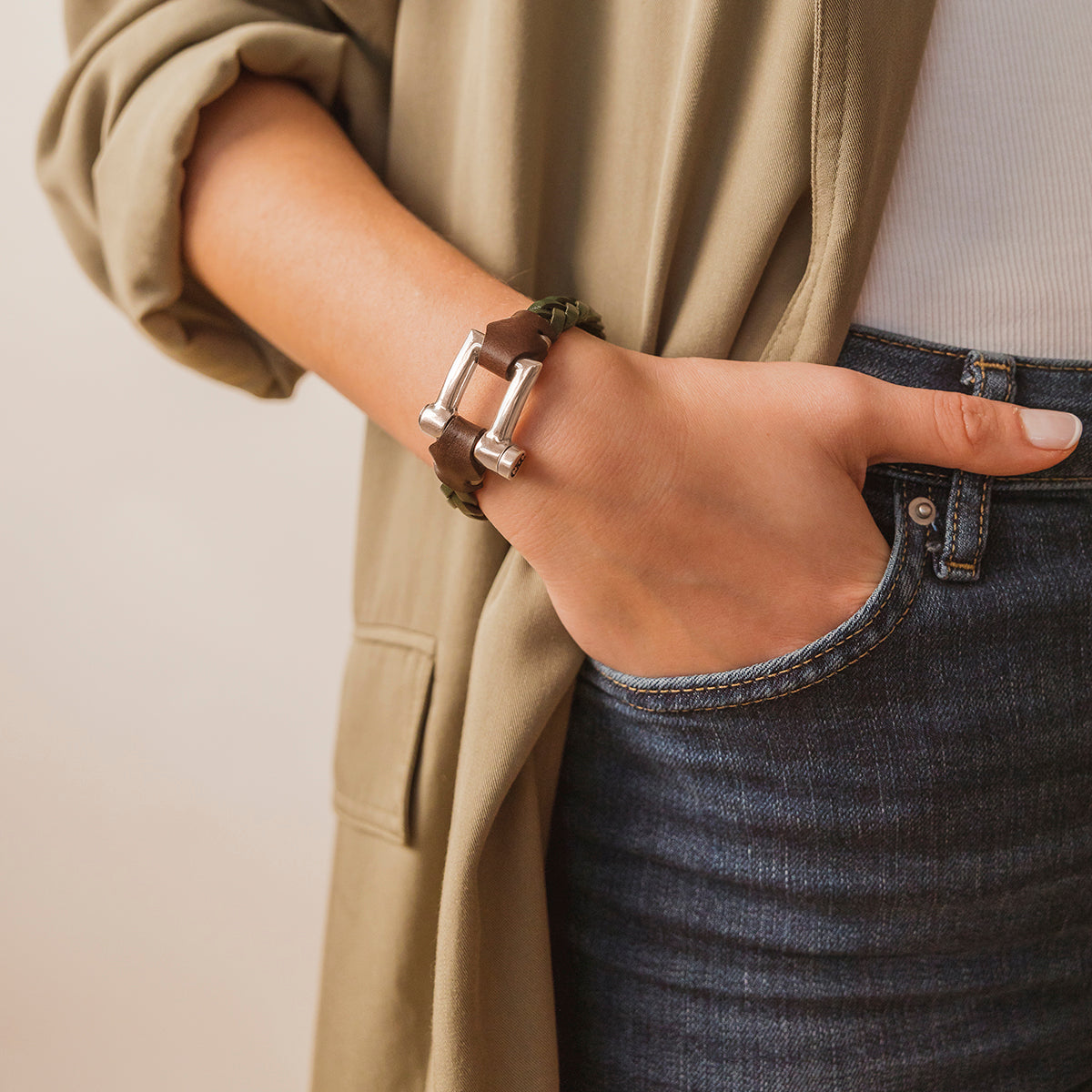 Braided leather bracelet in crisp green color 10 mm wide. Silver plated closure.