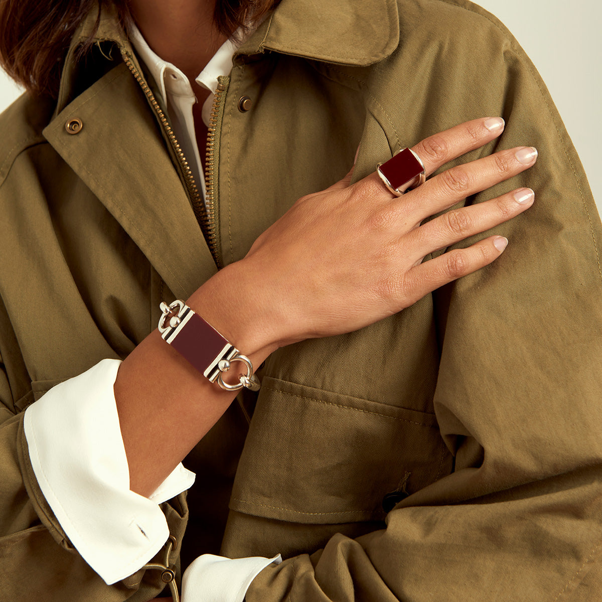 Silver plated bracelet. It has a Bordeaux colored methacrylate plate.