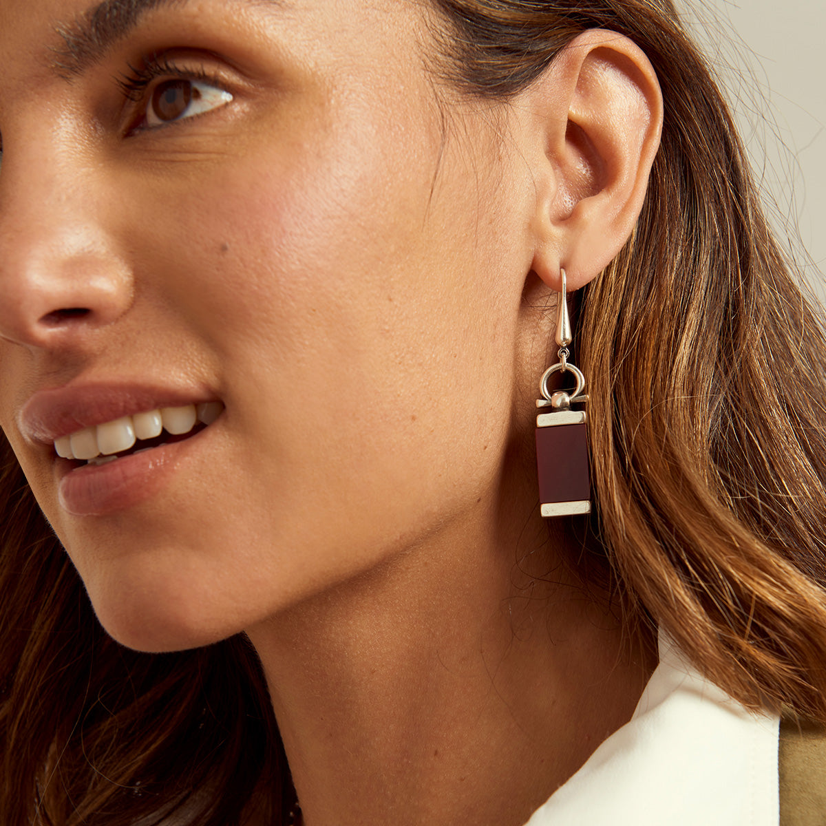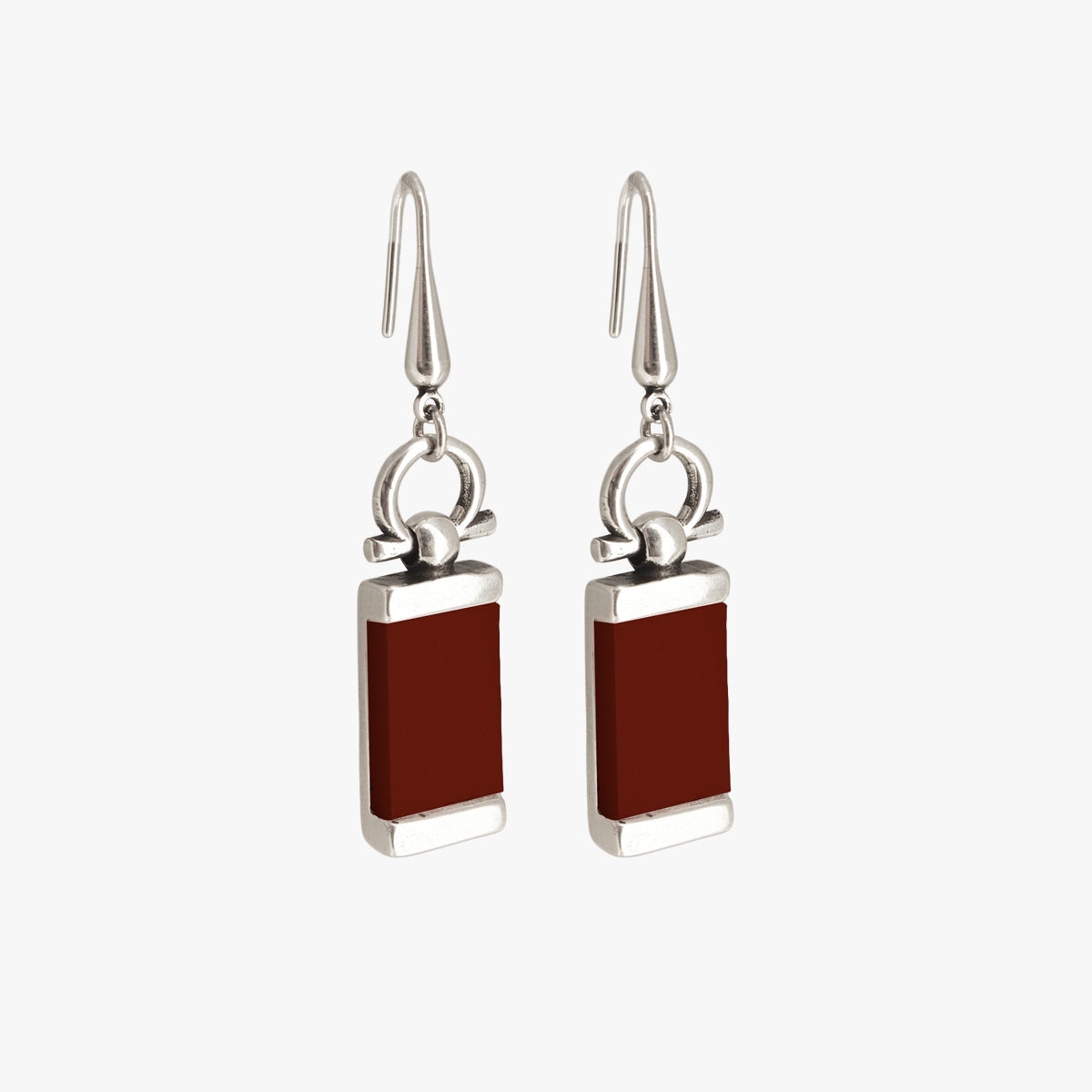 Silver plated earrings. They incorporate a pair of burgundy methacrylate plates