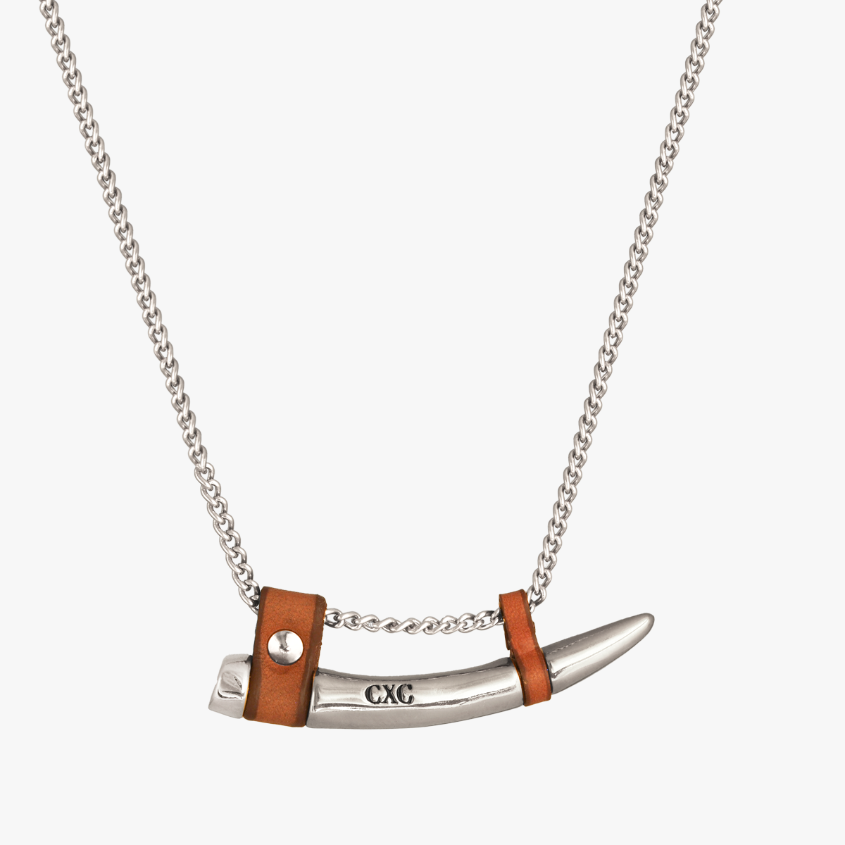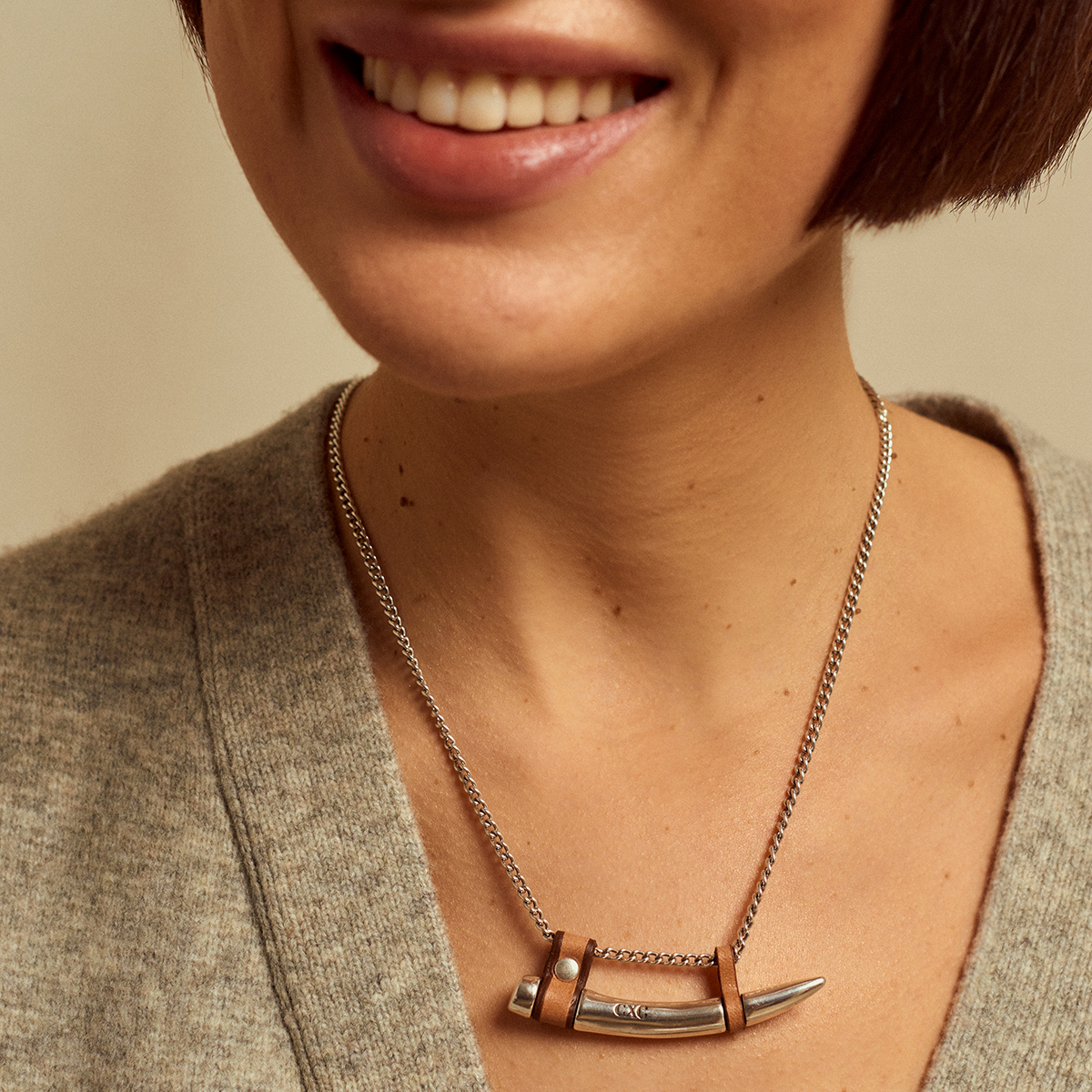 Silver-plated necklace with a tusk motif attached with leather. Size: adjustable to the neck from 37 to 59.5 cm approx, with a 6 cm curved tusk. Weight: 24.6 grams.