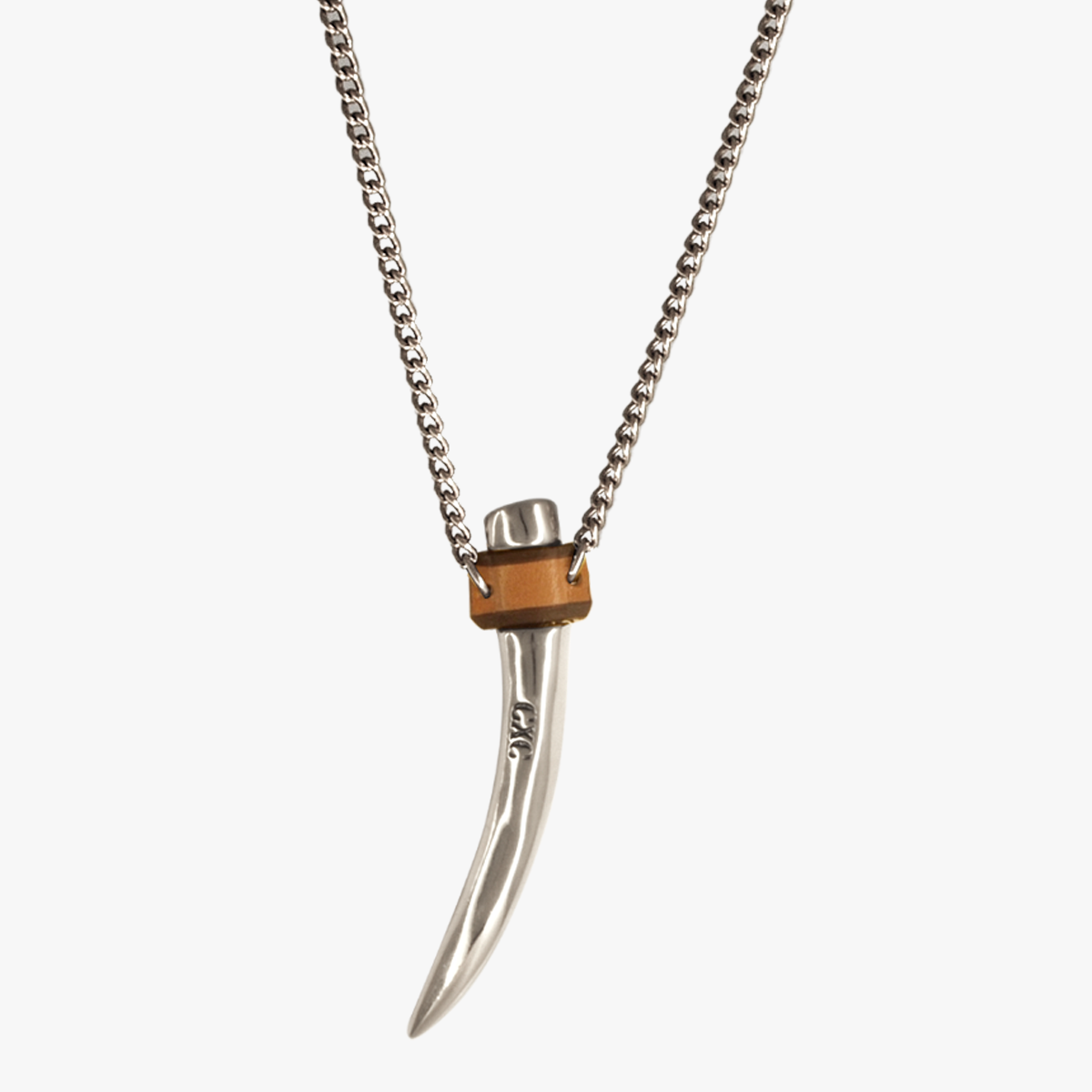 Silver plated necklace with fang motif secured with leather. Size: adjustable to the neck from 36.5 to 53 cm, curved fang of 6.5 cm. Weight: 23.1 gr.