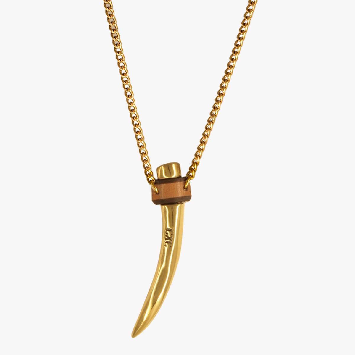 Gold plated necklace with fang motif secured with leather. Size: adjustable to the neck from 36.5 to 53 cm, curved fang of 6.5 cm. Weight: 23.3 gr.