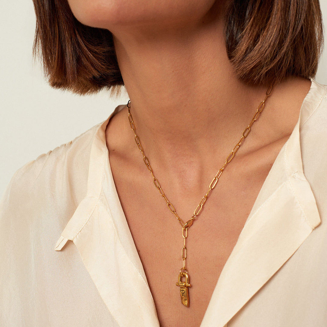 Fine Chain Collar with Shackles and Pendant, a sophisticated and modern design that merges the delicacy of a fine chain with the distinctive touch of the shackle and the pendant. Perfect for those looking for an elegant accessory full of character that complements any style.