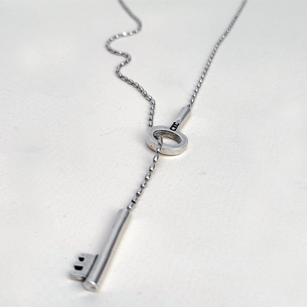 Taille du périmètre du cou de 30 cm à 50 cm. Longueur de la chaîne 80 cm. Breloque clé en deux pièces. Partie œillet de 3,5 cm de large x 2 cm de large. Et clé traversante de 3,5 cm de long x 1 cm de large. Mesures avec le collier :