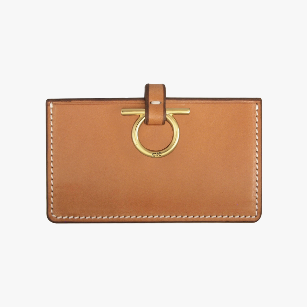Portacarte in pelle conciata al vegetale color cammello con finiture dorate a forma di omega.