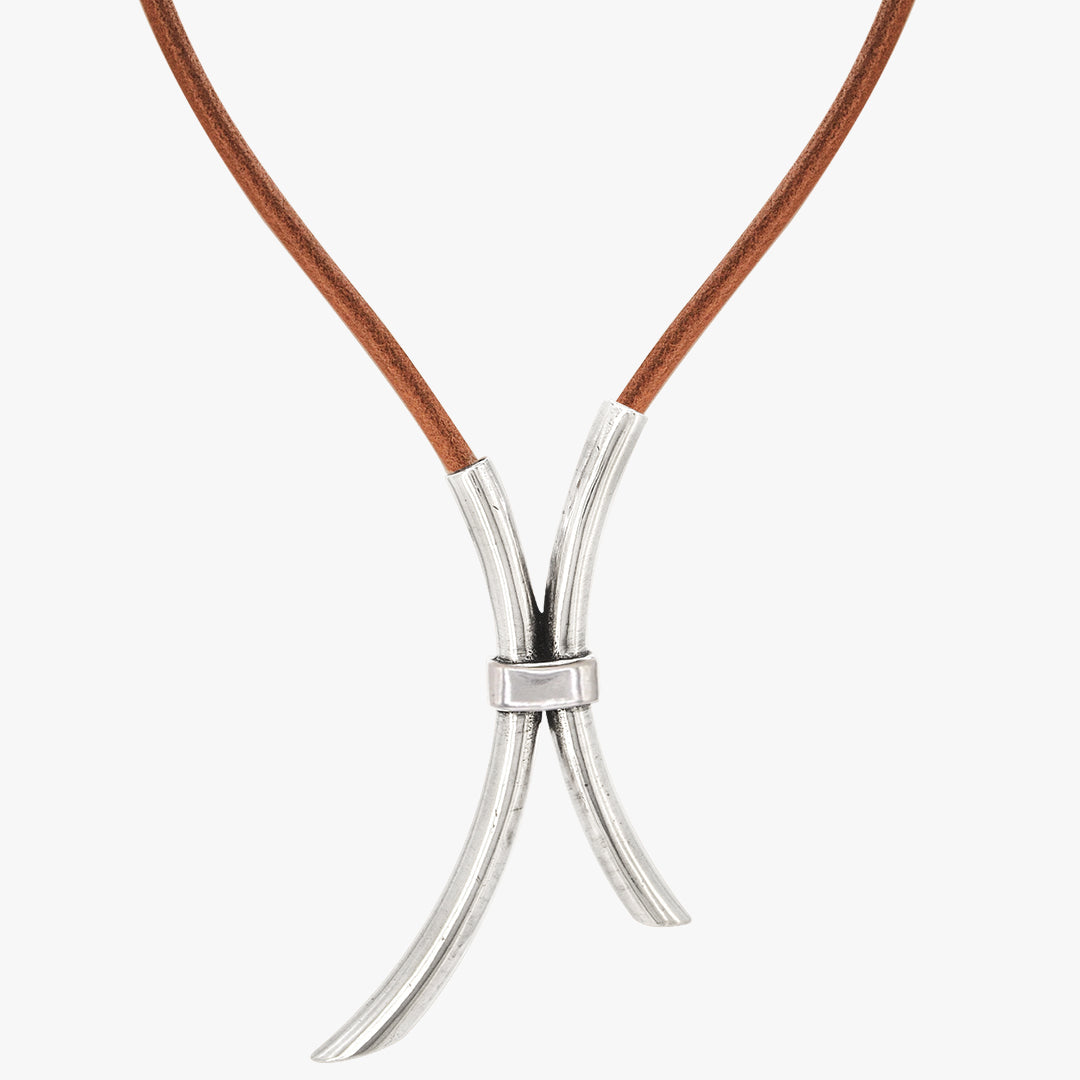 Collana Desvío Cuero, una pieza única que combina la morbidezza del cuoio con un design audace e moderno. Ideale per chi cerca un tocco di originalità e sofisticazione, questa collana è perfetta per esaltare qualsiasi look con un'aria di eleganza disinvolta.