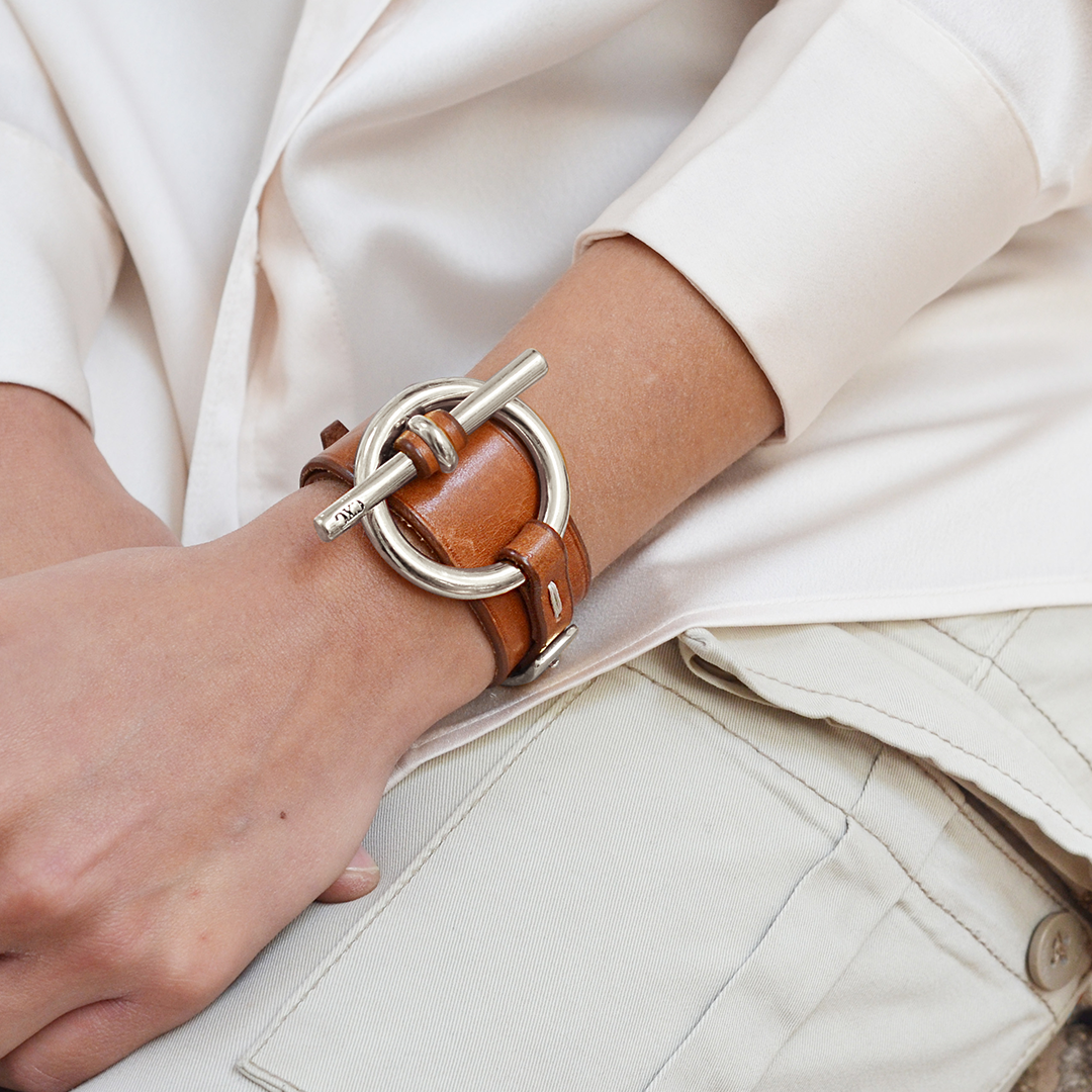 Una pieza para destacar, así es este brazalete grueso de cuero camel con cierre de plata. La piel está curtida vegetalmente y con una aleación de metales bañados en plata. También disponible en oro. Diseño exclusivo de CXC, elaborado de manera artesanal en España.