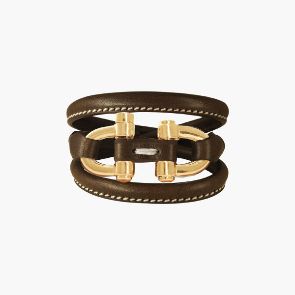 Pulsera bañada en Plata con cuero tubular marrón, canto lujado, pintado, repasado y pulido manualmente tres veces. Costuras a mano.